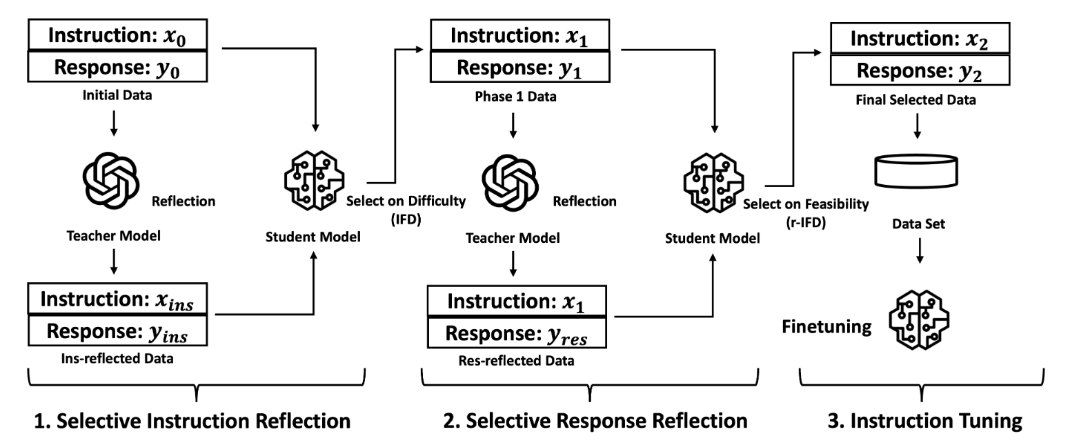 本文尝试引入学生的信息来帮助进行数据增强。原本以教师为中心的反思微调(Reflection-Tuning)方法包含两个步骤: