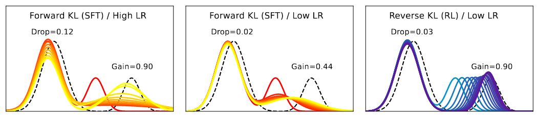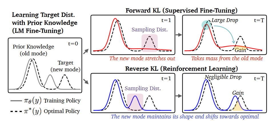 通常认为,SFT使用的FKL(mean-seeking),相比于RL对应的RKL(mode-seeking),更能保留分布信息,从而在llm灾难性遗忘问题上有较好的缓解,但是本文提出,在原本的分布多模态假设下,RL可以在尽可能保留原本旧模态分布的情况下,学习新的模态,从而相比于SFT,在遗忘问题问题上有更好的表现。