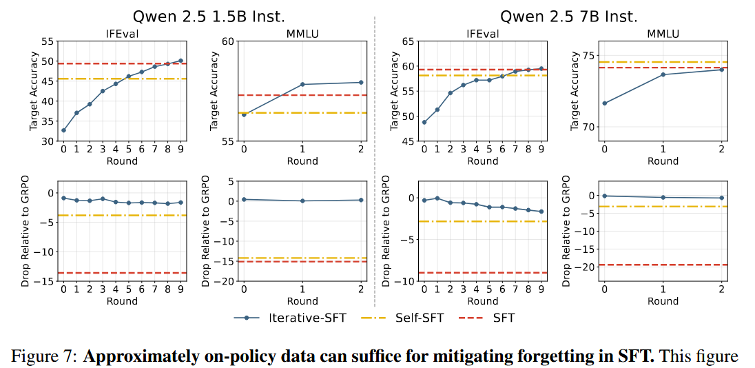 利用这一点,我们显然也可以尝试对SFT进行on-policy的数据运用来尝试缓解灾难性遗忘。这个的成本是高昂的,但是如果做一个权衡: