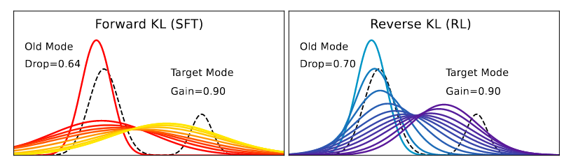 通常认为,SFT使用的FKL(mean-seeking),相比于RL对应的RKL(mode-seeking),更能保留分布信息,从而在llm灾难性遗忘问题上有较好的缓解,但是本文提出,在原本的分布多模态假设下,RL可以在尽可能保留原本旧模态分布的情况下,学习新的模态,从而相比于SFT,在遗忘问题问题上有更好的表现。