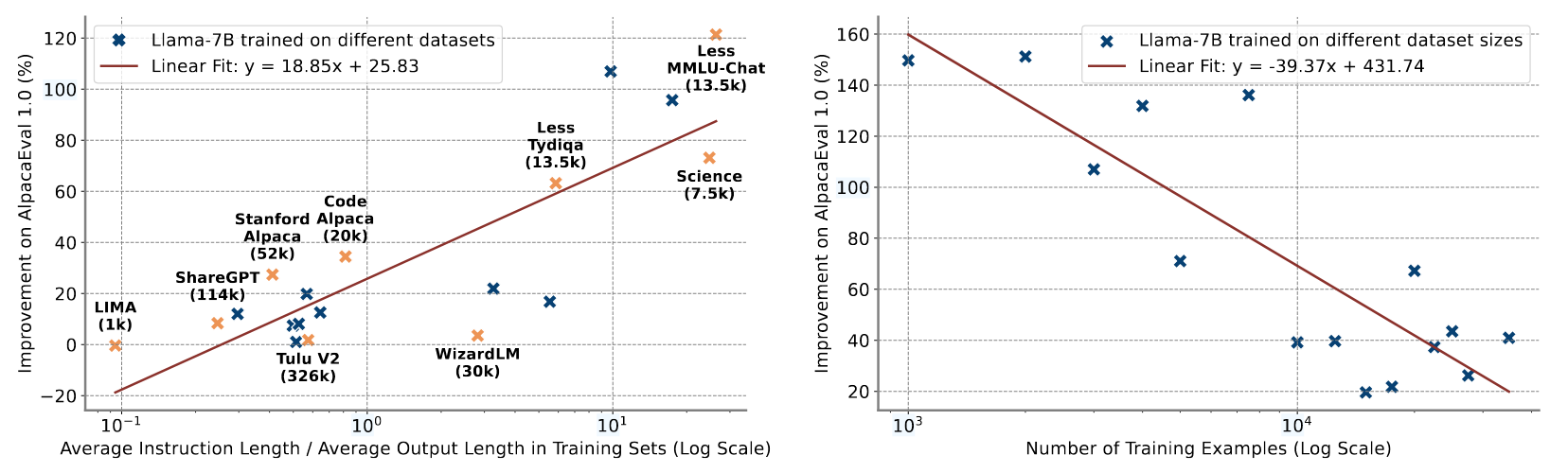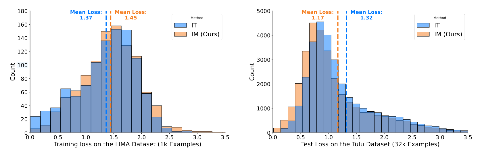 这里左侧的LIMA数据集用于训练,右侧的Tulu数据集用于测试。可以看到与指令序列对齐之后,在训练集上的Loss相对变大,但是测试集上的Loss变小了。这里测试时只考虑response上的生成质量。