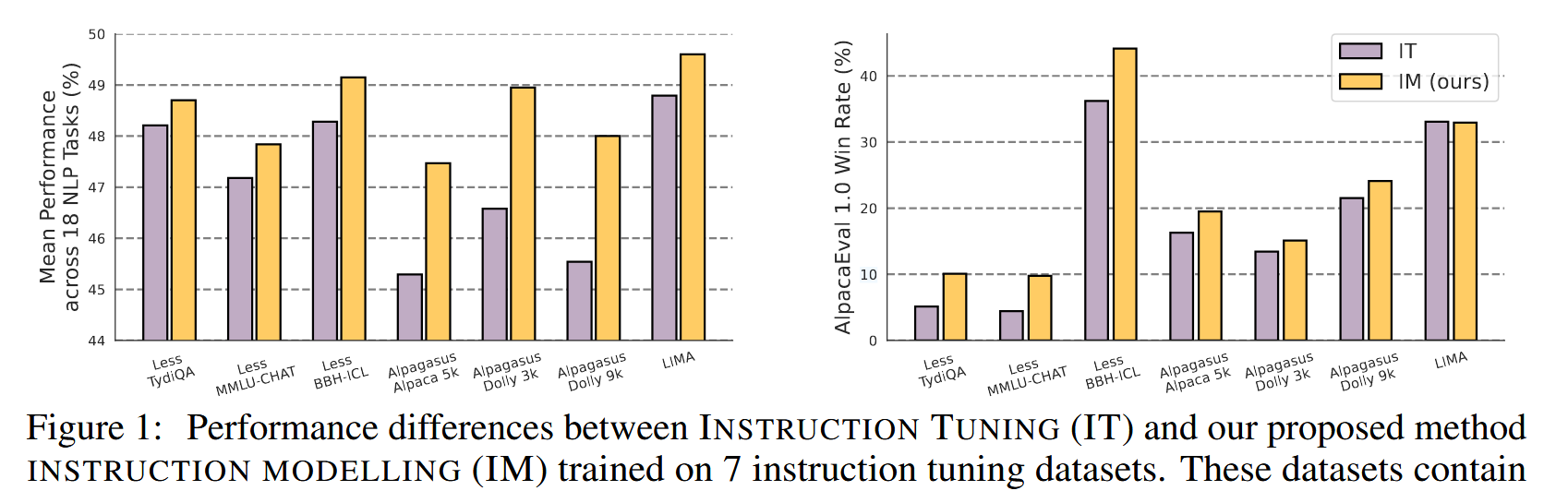 提出在对llm做fine tuning的时候,指令部分也加入loss计算。给定指令序列\(I\)以及对应的Response序列\(C\),原本的训练目标可以表示为 \[ P(C|I) = \sum_{t=1}^{|C|}P(c_{t}|I,c_{<t}) \] 考虑到指令序列之后,训练目标可以表示为 \[ P(C,I) =\sum_{t=1}^{|C|+|I|} P(x_{t}|x_{<t}) \] 这样做的动机是,作者认为,当训练数据中指令序列很长而response很短的时候,只对齐response,可能会导致过拟合,而当训练数据很少的时候,这一点可能会更加严重。此时加入对指令序列的对齐,可以充当一个正则化的作用。