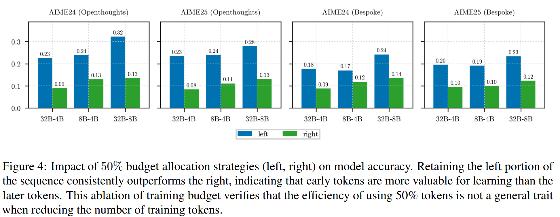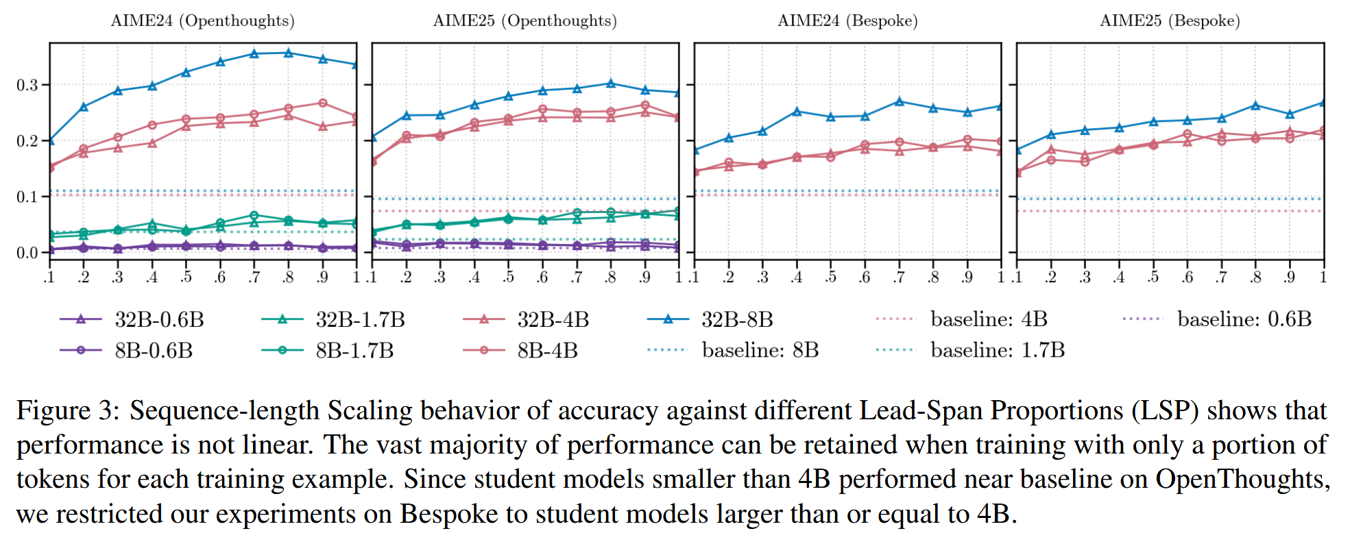 蒸馏的时候,直接用CoT,就可以取得与原本基本一致的效果 学生规模较大(>4B)时,对蒸馏数据按照\(p=0.5\)截断,训练压力会下降很多,同时保持不错的训练效果。(这一结论在小模型上效果不明显,但我认为可能是实验设置不合理导致的,保留意见)