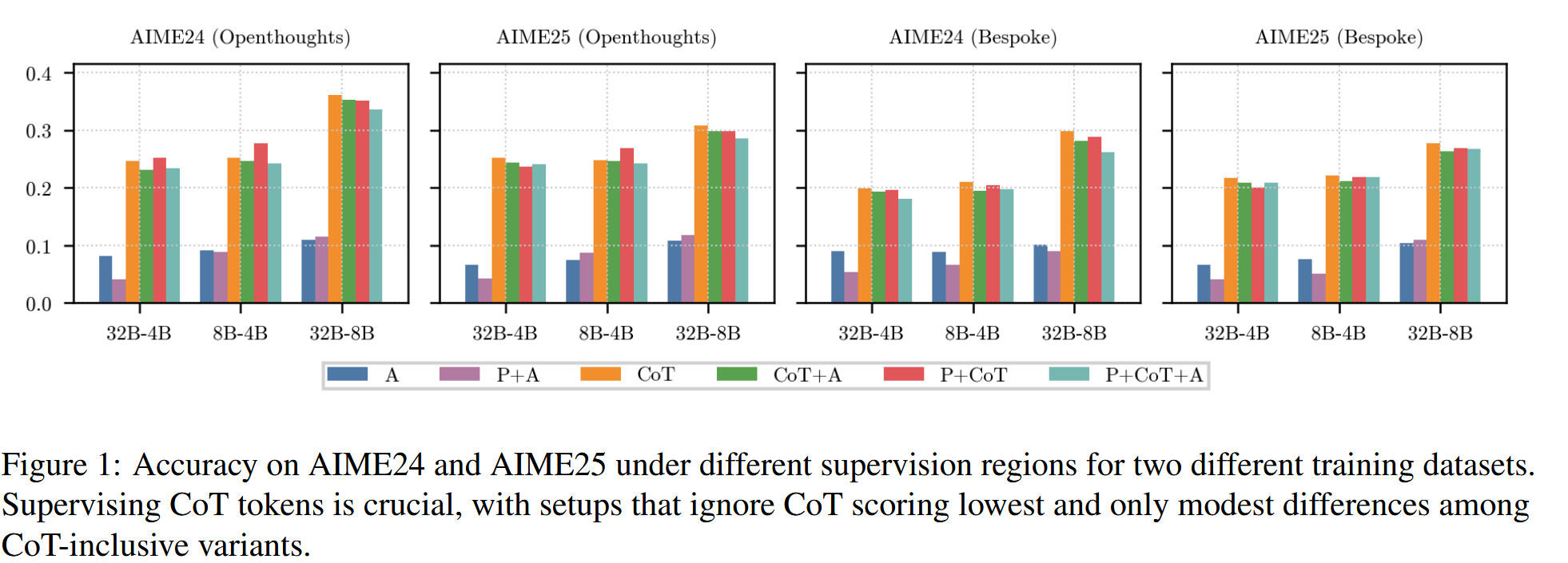 作者通过实验发现,只需要对齐CoT部分,就能取得与整条数据都训练相当的效果,有时候甚至更好。而一旦去除CoT部分的对齐,性能就会非常低;同时在对齐CoT的情况下,再对齐P或者A,对结果基本没啥影响。